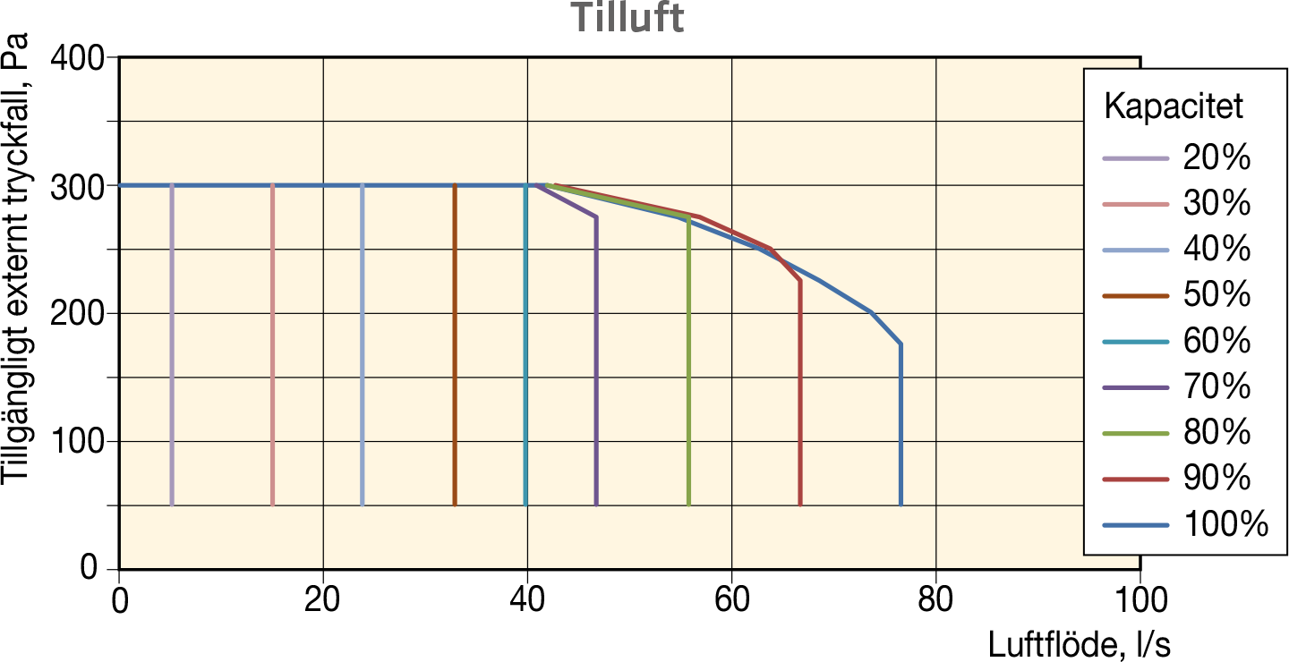 1,8 kW, vattenbatteri på upp till 1,6 kW eller förstärkt vattenbatteri på upp till 2,8 kW. Om ett vattenbatteri används, rekommenderar vi att ett automatiskt uteluftsspjäll monteras på uteluftskanalen för att